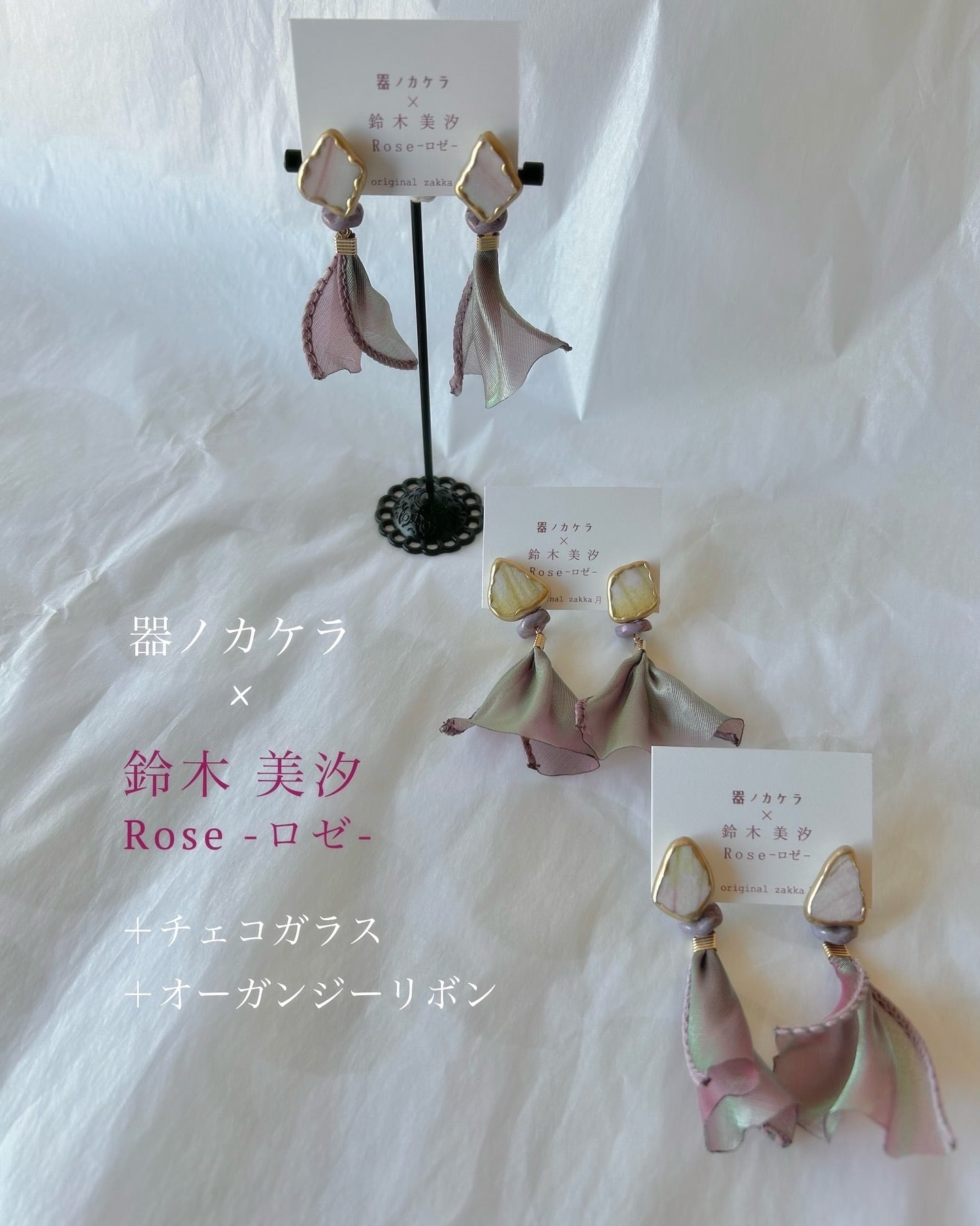 【イヤリング】器ノカケラ(鈴木美汐-Rose)+チェコガラス、オーガンジーリボン