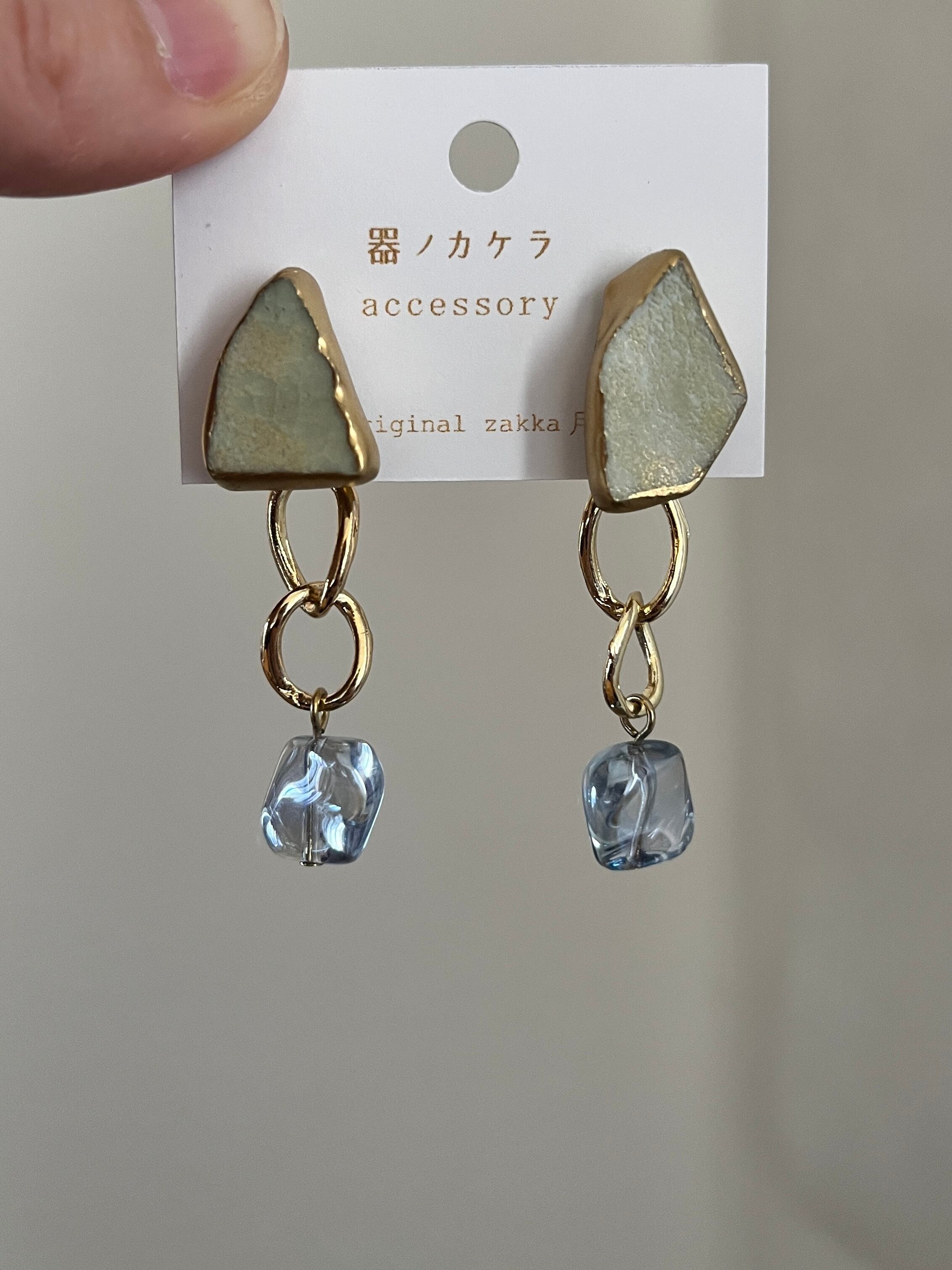 【イヤリング】器ノカケラ(グリーン釉)+ブルーガラス